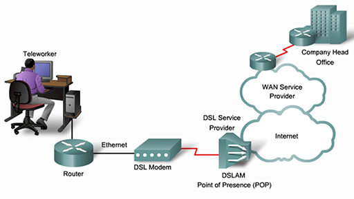 - The diagram above shows a home office worker connecting to their ISP using DSL. This provides them with a connection to the Internet and to the business WAN of their employer.