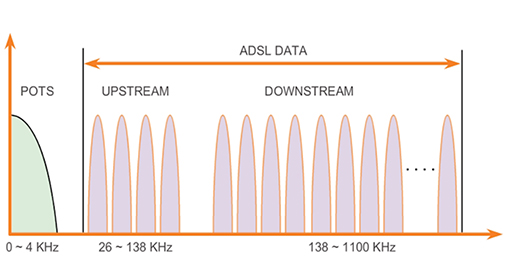 - DSL divides the 4 KHz to 1 MHz bandwidth into different transmit (upstream) and receive (downstream) channels, which it uses to connect the home to the ISP. The diagram below shows a DSL system with more downstream channels than upstream channels, meaning that it can support higher download than upload speeds. This is referred to as asynchronous DSL (ADSL), and is ideal for home users connecting to the Internet, as the majority download rather than upload content.