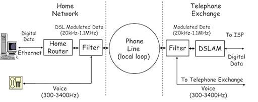 - A filter is also used at the exchange to separate the telephone signal, which is fed to the telephone exchange, and the DSL signal, which is sent to the DSLAM and then towards the ISP WAN for connection to the Internet.